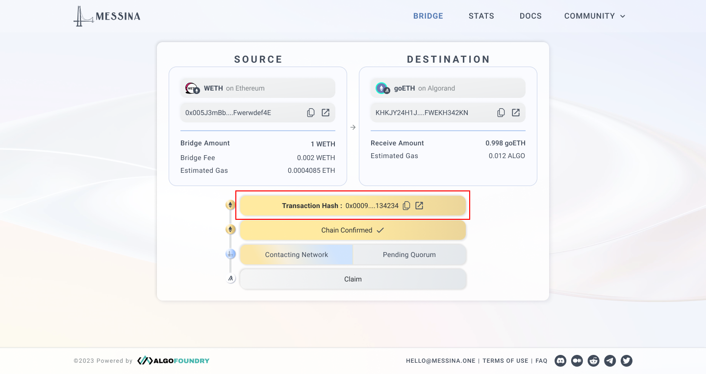 Sign the transaction popups in your Source chain wallet. Once it's complete, a transaction hash will be generated for the Source chain.