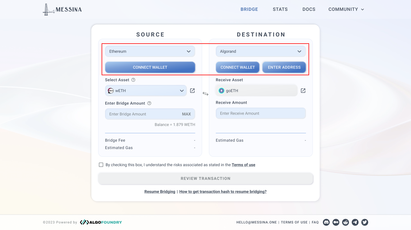 Select a Source and Destination chain, then connect the respective wallets.