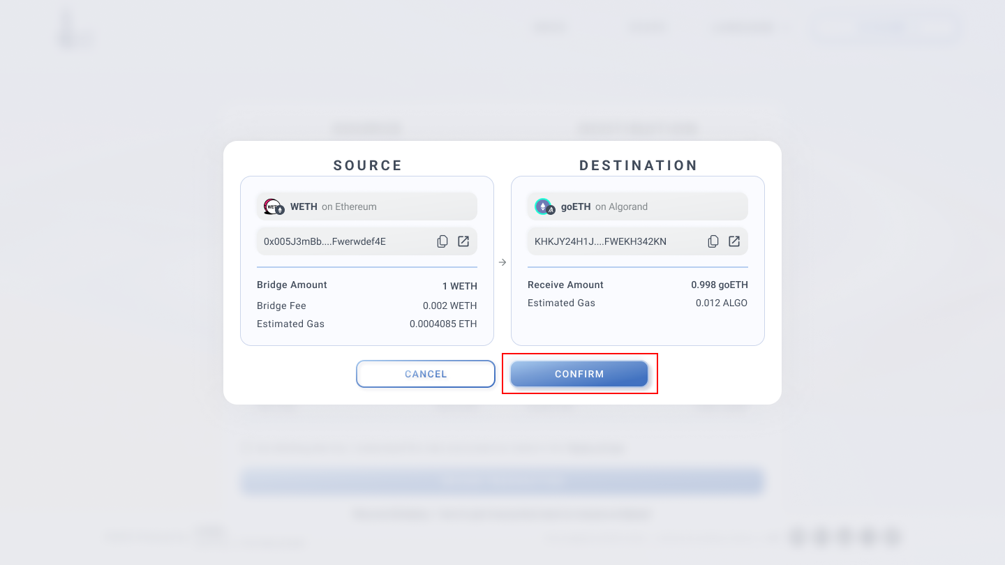 A confirmation popup will appear where you can double check the transaction details before bridging. Click "Confirm" to start the bridging process.
